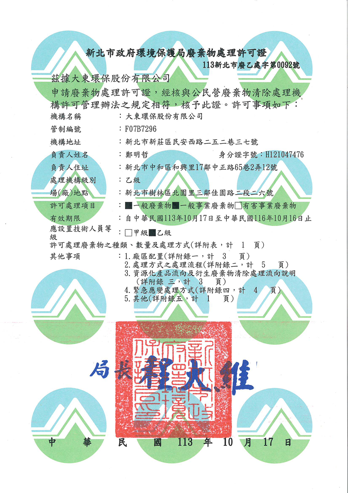 大東環保 於 113 年 10 月 17 日獲得新北市政府環境保護局的廢棄物處理許可證,許可字號為 113 新北市廢乙處字第 0092 號,管制編號 F07B7296;百里環保 於 113 年 04 月 29 日獲得新北市政府環境保護局的廢棄物清除許可證,許可字號為 113 新北市廢乙清字第 0042 號,管制編號 F06C9284。